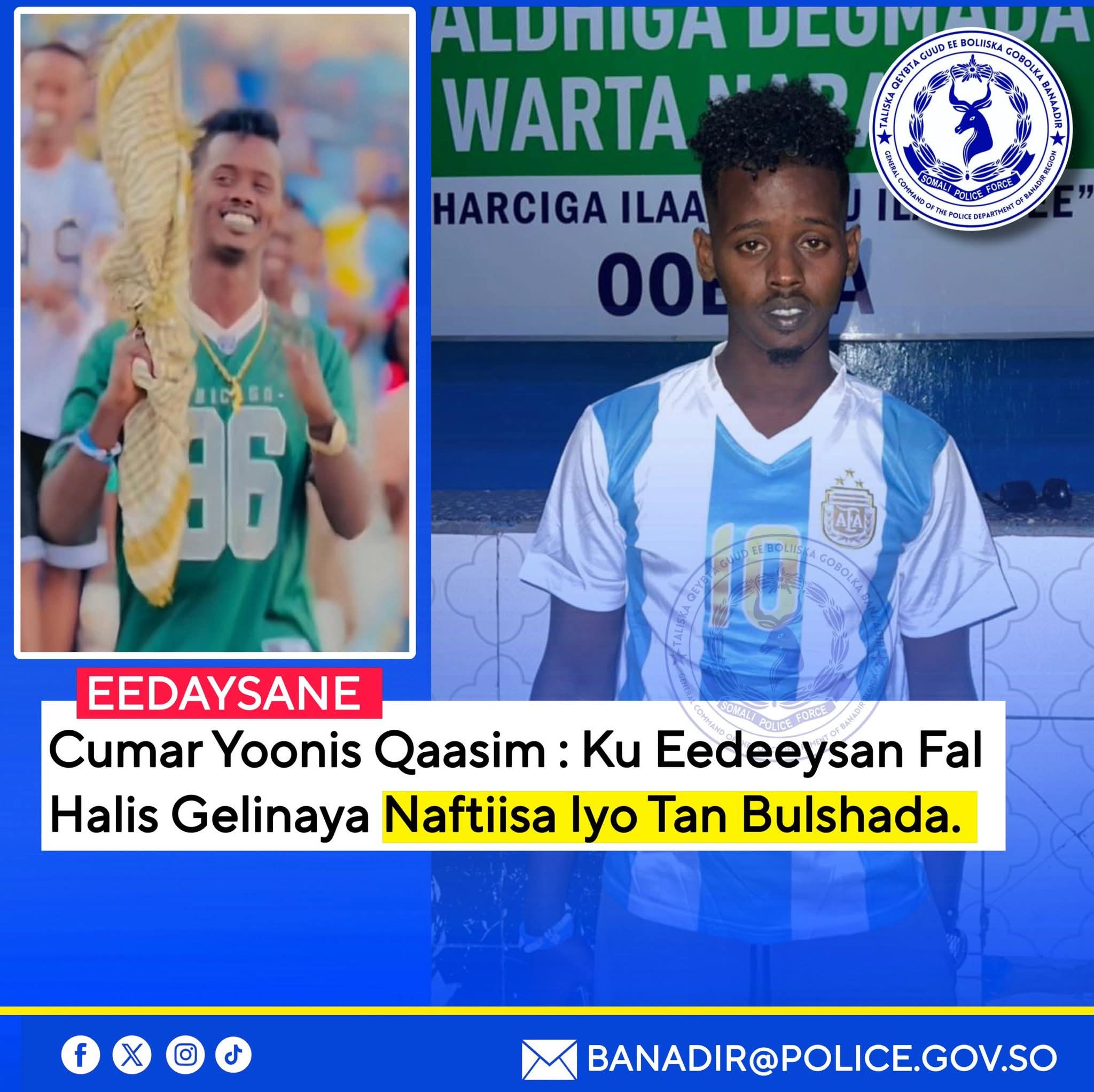 Muqdisho, 2 Oktoobar 2025 – Ciidanka Booliska Soomaaliyeed, gaar ahaan Saldhigga Degmada Warta-Nabadda, ayaa gacanta ku soo dhigay laba eedeysane oo kala ah Askari iyo shacab oo ku kacay fal halis gelinaya naftooda iyo tan dadweynaha.